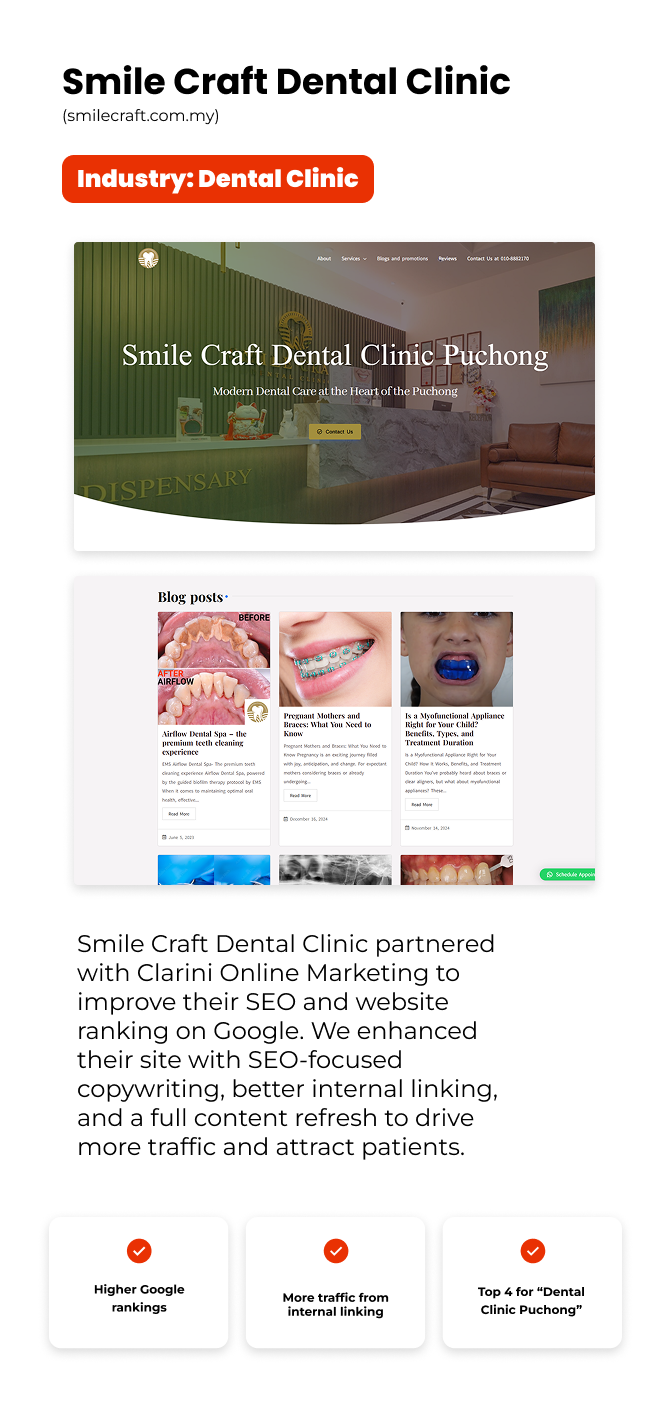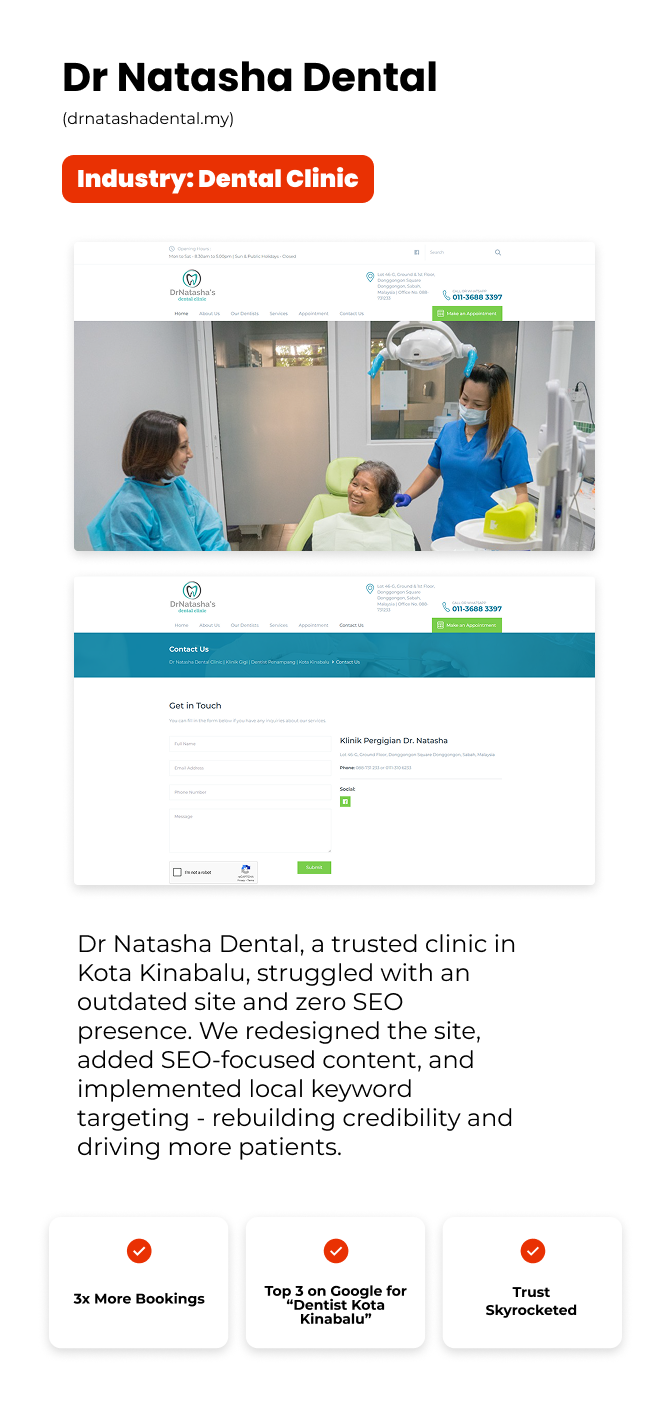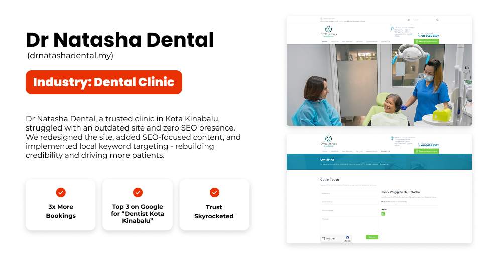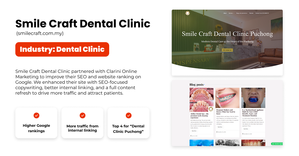 “Within 60 days, we went from Page 4 to the #1 spot for ‘Puchong dentist’. Our weekly bookings